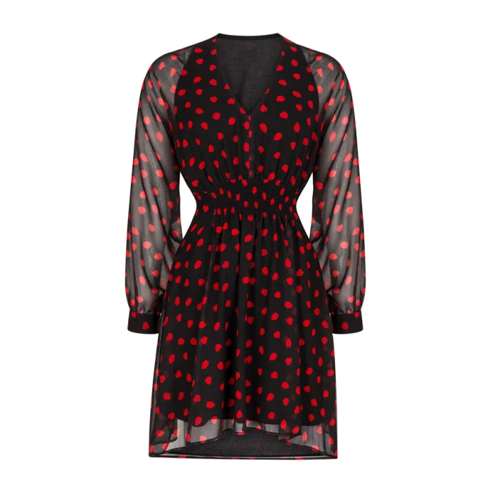 Elastic Cuff V Neck Pattened Red Mini Dress