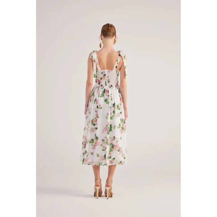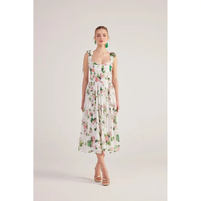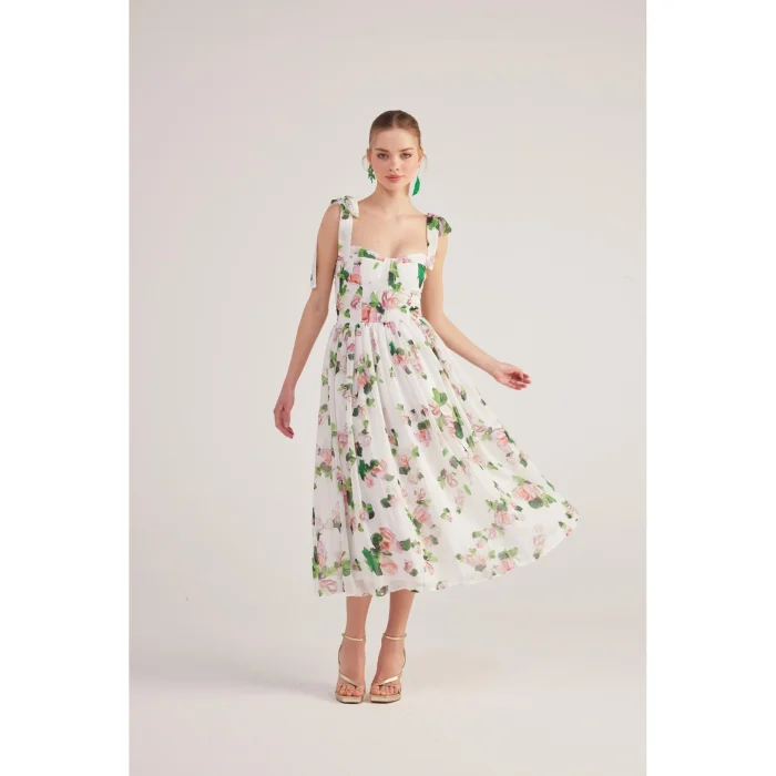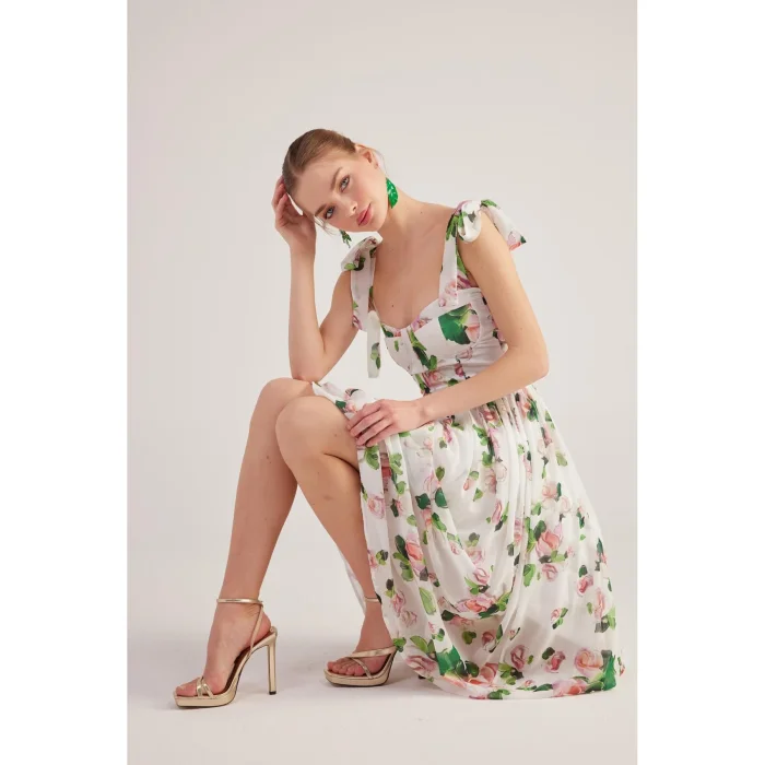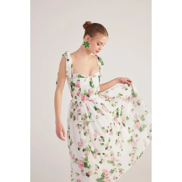 The model size is XS. This long chiffon dress, which stands out with its floral patterns, tie details on the shoulders and gloped design, offers a romantic and elegant look. Its lightweight chiffon fabric creates a fluid silhouette as it moves, while its long fit provides a feminine and sophisticated presence. While the shoulder tie details add an elegant touch to the design, they offer an ideal choice for special occasions and summer evenings. Model dimensions: Height 1.75 | Bust 79 | Waist 58 | Hip 88.