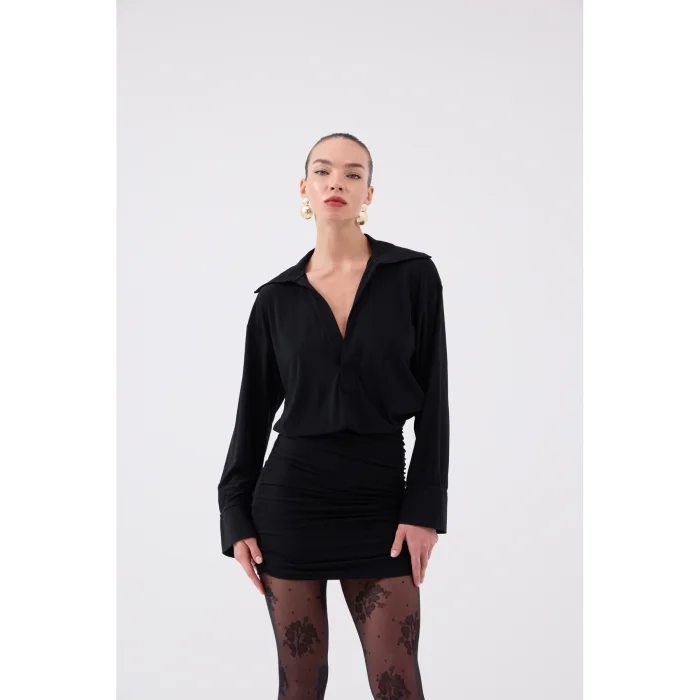 Product: Jaida Shirt Collar Dress With Gathered Hem Detail - Black