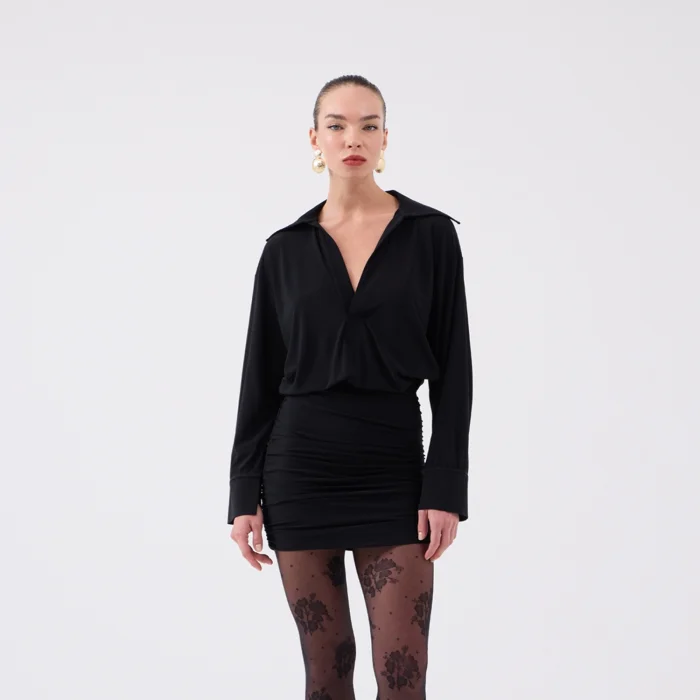 The size on the model is XS. Jaida dress with a shirt collar design with a smocked skirt; It offers a stylish look with its long-sleeved cuffed structure and zipper closure. Thanks to its lycra and flexible fabric, it elegantly hugs the body and provides comfort all day long. With its modern cut, it is a stylish mini dress that can be preferred both for daily use and for special combinations. The fabric content is 92% polyester and 8% elastane. It is recommended that you review our size chart before placing your order.