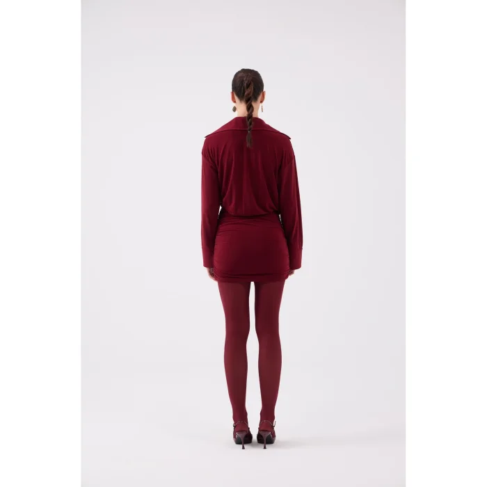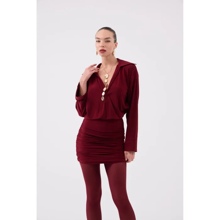 The size on the model is XS. Jaida dress with a shirt collar design with a smocked skirt; It offers a stylish look with its long-sleeved cuffed structure and zipper closure. Thanks to its lycra and flexible fabric, it elegantly hugs the body and provides comfort all day long. With its modern cut, it is a stylish mini dress that can be preferred both for daily use and for special combinations. The fabric content is 92% polyester and 8% elastane. It is recommended that you review our size chart before placing your order.