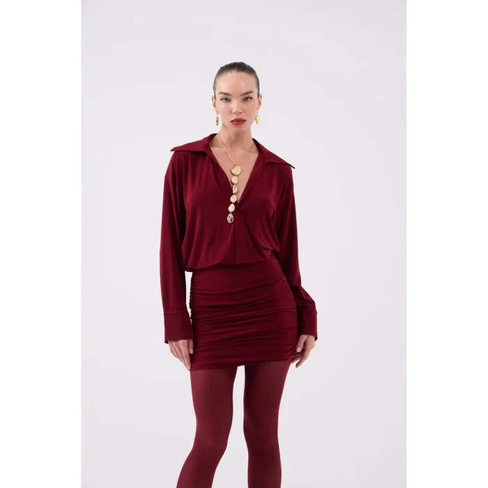 The size on the model is XS. Jaida dress with a shirt collar design with a smocked skirt; It offers a stylish look with its long-sleeved cuffed structure and zipper closure. Thanks to its lycra and flexible fabric, it elegantly hugs the body and provides comfort all day long. With its modern cut, it is a stylish mini dress that can be preferred both for daily use and for special combinations. The fabric content is 92% polyester and 8% elastane. It is recommended that you review our size chart before placing your order.