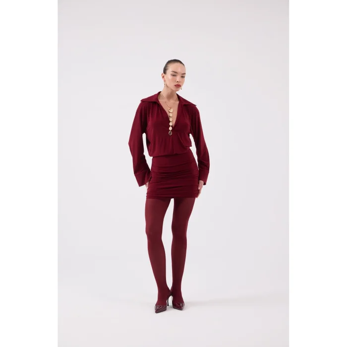 The size on the model is XS. Jaida dress with a shirt collar design with a smocked skirt; It offers a stylish look with its long-sleeved cuffed structure and zipper closure. Thanks to its lycra and flexible fabric, it elegantly hugs the body and provides comfort all day long. With its modern cut, it is a stylish mini dress that can be preferred both for daily use and for special combinations. The fabric content is 92% polyester and 8% elastane. It is recommended that you review our size chart before placing your order.