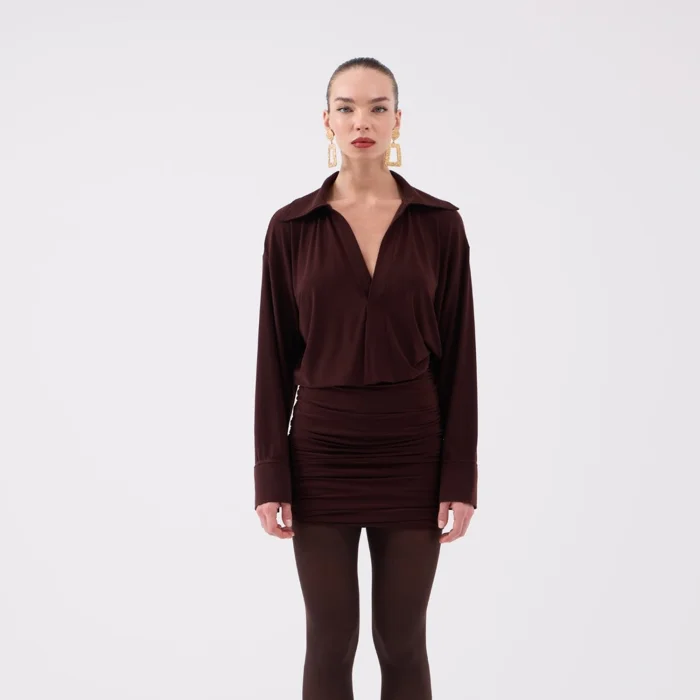 The size on the model is XS. Jaida dress with a shirt collar design with a smocked skirt; It offers a stylish look with its long-sleeved cuffed structure and zipper closure. Thanks to its lycra and flexible fabric, it elegantly hugs the body and provides comfort all day long. With its modern cut, it is a stylish mini dress that can be preferred both for daily use and for special combinations. The fabric content is 92% polyester and 8% elastane. It is recommended that you review our size chart before placing your order.