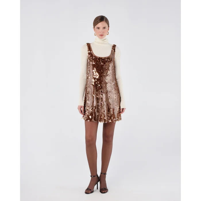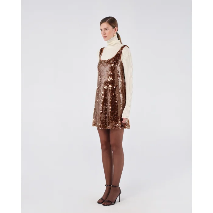 Slip-on design with a relaxed shift silhouette, adorned with dazzling brown sequins for a bold, glamorous look. Sleeveless design with a scoop neckline and a deep scoop back, offering a modern and flattering shape. Mini-length hem perfect for evening wear or special occasions. Lightweight fabric that moves with ease while maintaining a luxurious shine. Model is 174 cm tall and is wearing size Small. This dress is designed to capture attention, combining comfort with glamorous sparkle for an unforgettable night out.