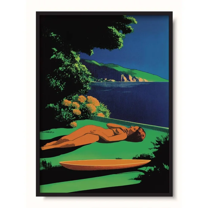 A peaceful figure reclining next to a canoe as calm blue ocean waters stretch out into the distant hills in the background.