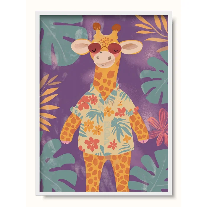 A giraffe dressed in a floral shirt among tropical vegetation.
