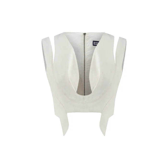 An ode to our skill in crafting unique pieces, our Ron denim crop top is a standout piece. Adorned with cut out details on shoulders and deep lownecked this top exudes modern elegance. A metallic zip closure extends on the back.