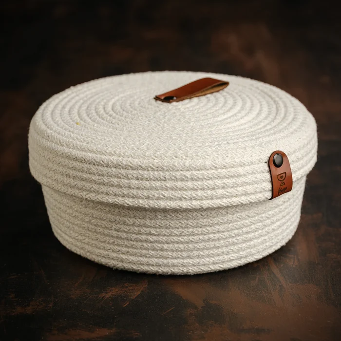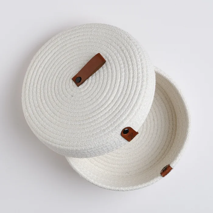Stylish, decorative 100% handmade cotton rope basket in 20x8 dimensions with lid, which you can use as an organizer. You can use it in every area of your home, kitchen, bathroom, etc. to organize your belongings. ; Our products are made with high-quality genuine leather and eco-friendly materials. ; These unique products, designed by preserving the beauties of nature, offer you the perfect harmony of both elegance and naturalness. ;