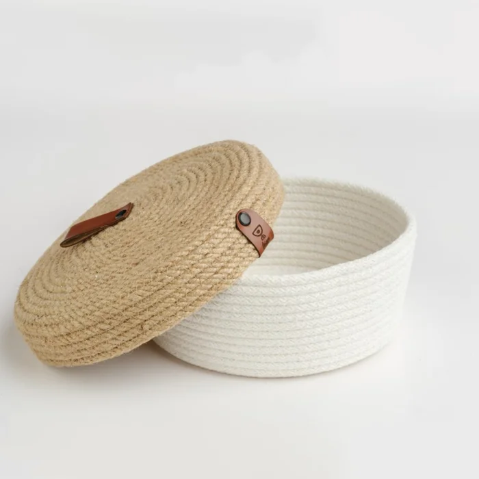 Stylish decorative 100% handmade cotton rope basket with lid in sizes 20×8 that you can use as an organizer. You can use it to organize your belongings in every area of your home.