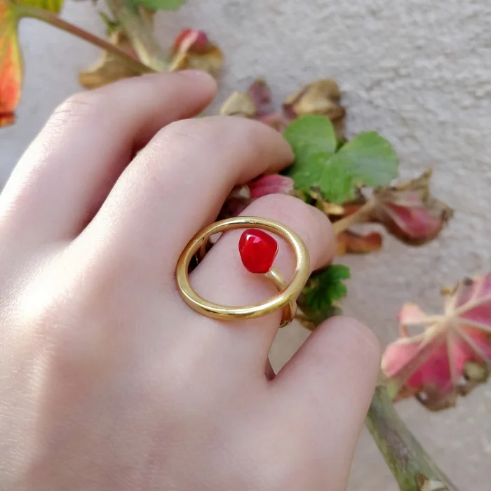Lampwork pomegranete seed ring. It is made flameworking glass technique and handmade one-of a kind piece. 22K gold plate on silver hoop.
