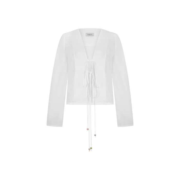 A long-sleeved blouse with a V-neckline and front tie detailProduct: Anemone Linen ShirtDesigner: KalipsoProduct Code: KLPS/03/L/SS24This product will be sent by Kalipso on behalf of hipicon