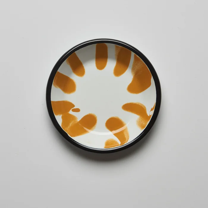 Handmade with infusion technique, yellow enamel mini plate with black rim.