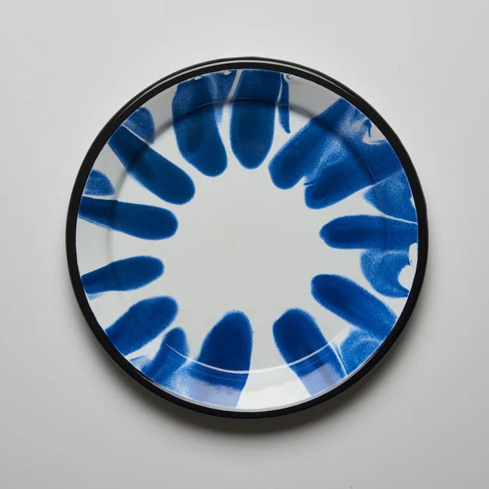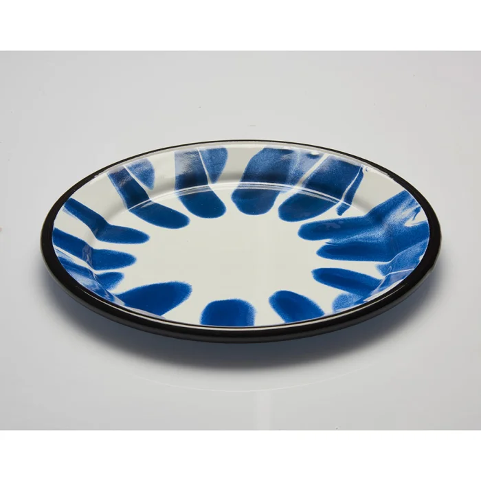 Handmade with infusion technique, blue enamel plate with black rim.