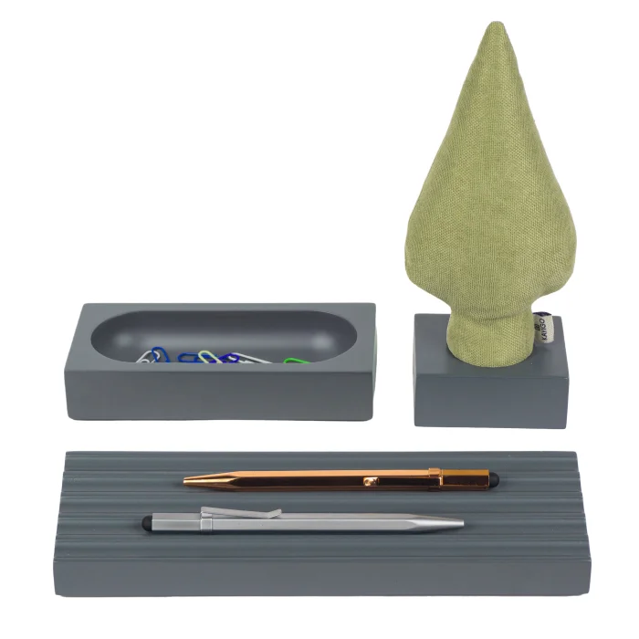 It comes with a pen holder, an organizer and a tree note holder. Includes 3 thumbtacks.