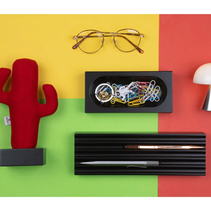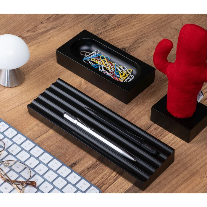 It comes with a pen holder, an organizer and a cactus note holder. Since wood is a natural material, it can show pattern and color differences.