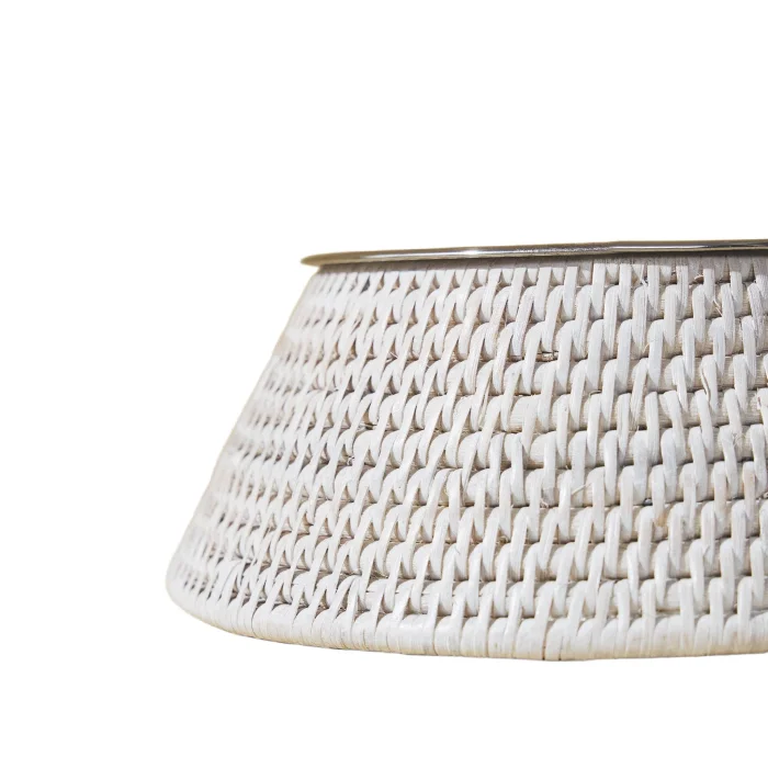 Rattan Pet Food Bowl: Made using sustainable 1st class rattan, this product is made with the traditional tight hand-knitting technique used by master craftsmen in Yangon. Color: Matte White Tumbled Material: Handmade rattan, stainless steel Size: 24(L)X24(W)X8.5(H) cm