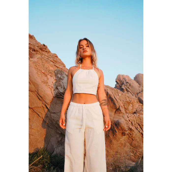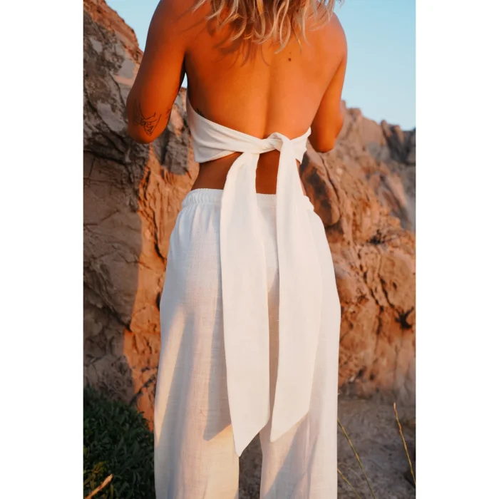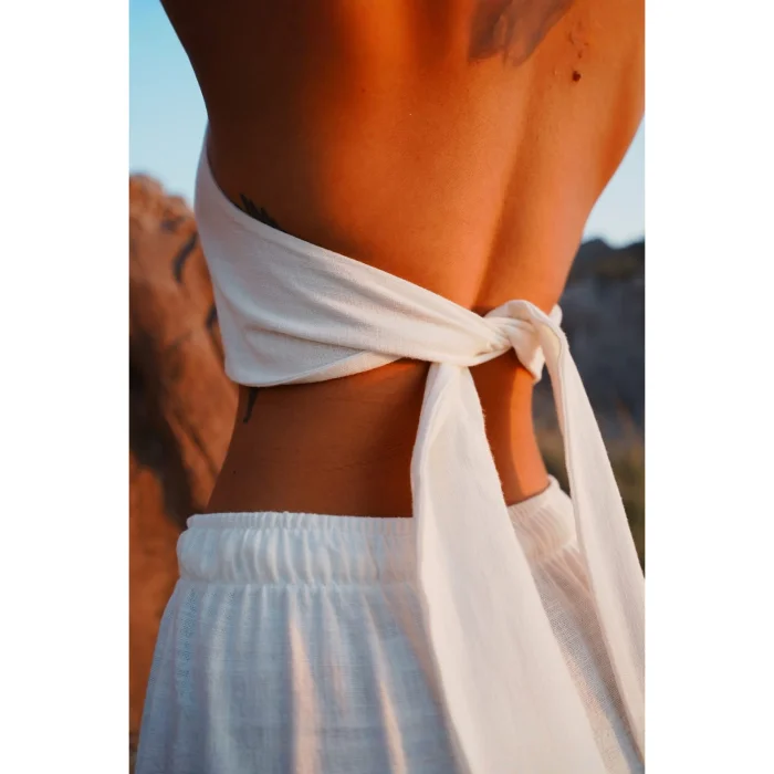 100% Linen, neck and back binding closure way adapts to every body, it is one size, it does not show inside