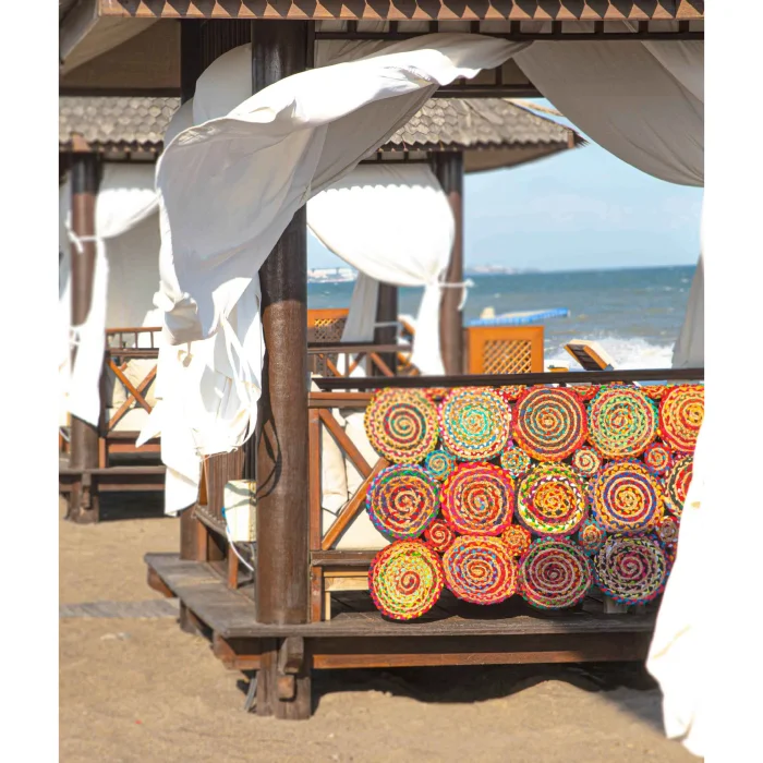 NATURA Jute is handloom-made in India from natural jute fibers. Jute carpets are hand-woven, special carpets produced from natural yarn that suit almost any style of decoration. It is recyclable, does not harm the ecological balance and is environmentally friendly. It is durable and unaffected by time, currents and trend wear. The carpet, which consists of many circular pieces, has a multi-colored design. Size options such as 90x150 cm, 120x180 cm, 160x240 cm and 200x290 cm are available. Natura Carpet features a minimal, modern flat-weave design that complements any décor. It is suitable for both indoor and outdoor use, is resistant to UV rays, resistant to moisture and mildew, and is easy to clean and maintain. Ideal for those looking for decoration, comfort and elegance in their living spaces. It's perfect for outdoors, gardens, and any space where you need durable and stylish floor coverings. The carpet adds vitality and energy to the environment with its vivid colors. Due to the natural state of the plants, color differences, color transitions, spots and various differences in the body of the plant are reflected in the product as it is. Again, there may inevitably be plus/minus differences in very small dimensions in the measurement of handmade products. It should be wiped with a damp cloth. Note: Actual colors may differ depending on lighting and monitor settings.