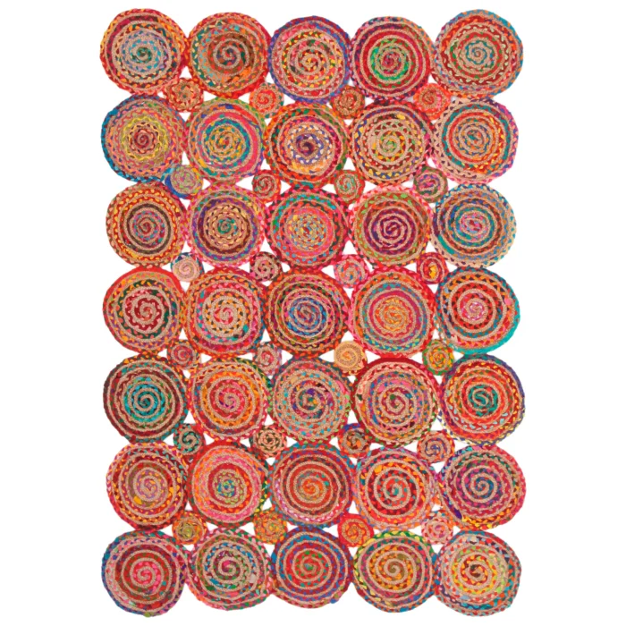 NATURA Jute is handloom-made in India from natural jute fibers. Jute carpets are hand-woven, special carpets produced from natural yarn that suit almost any style of decoration. It is recyclable, does not harm the ecological balance and is environmentally friendly. It is durable and unaffected by time, currents and trend wear. The carpet, which consists of many circular pieces, has a multi-colored design. Size options such as 90x150 cm, 120x180 cm, 160x240 cm and 200x290 cm are available. Natura Carpet features a minimal, modern flat-weave design that complements any décor. It is suitable for both indoor and outdoor use, is resistant to UV rays, resistant to moisture and mildew, and is easy to clean and maintain. Ideal for those looking for decoration, comfort and elegance in their living spaces. It's perfect for outdoors, gardens, and any space where you need durable and stylish floor coverings. The carpet adds vitality and energy to the environment with its vivid colors. Due to the natural state of the plants, color differences, color transitions, spots and various differences in the body of the plant are reflected in the product as it is. Again, there may inevitably be plus/minus differences in very small dimensions in the measurement of handmade products. It should be wiped with a damp cloth. Note: Actual colors may differ depending on lighting and monitor settings.