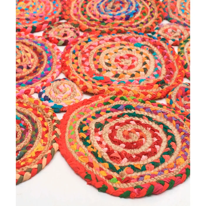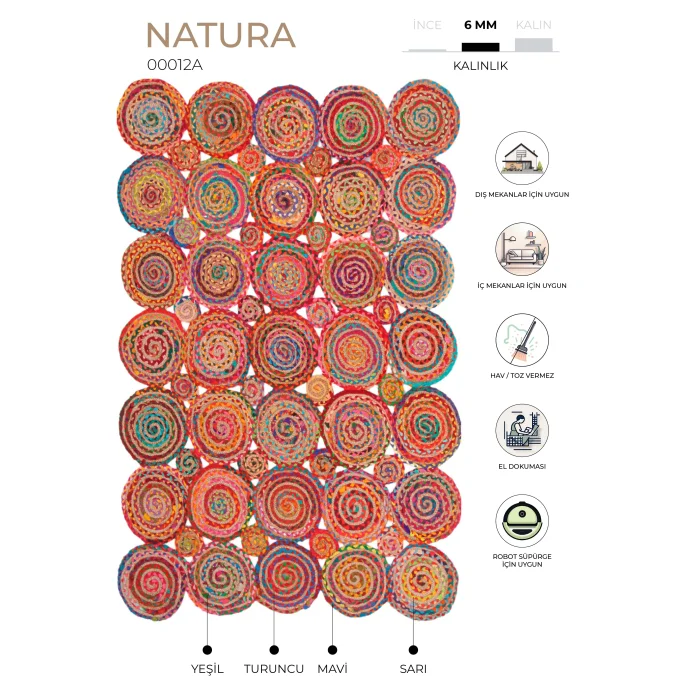 NATURA Jute is handloom-made in India from natural jute fibers. Jute carpets are hand-woven, special carpets produced from natural yarn that suit almost any style of decoration. It is recyclable, does not harm the ecological balance and is environmentally friendly. It is durable and unaffected by time, currents and trend wear. The carpet, which consists of many circular pieces, has a multi-colored design. Size options such as 90x150 cm, 120x180 cm, 160x240 cm and 200x290 cm are available. Natura Carpet features a minimal, modern flat-weave design that complements any décor. It is suitable for both indoor and outdoor use, is resistant to UV rays, resistant to moisture and mildew, and is easy to clean and maintain. Ideal for those looking for decoration, comfort and elegance in their living spaces. It's perfect for outdoors, gardens, and any space where you need durable and stylish floor coverings. The carpet adds vitality and energy to the environment with its vivid colors. Due to the natural state of the plants, color differences, color transitions, spots and various differences in the body of the plant are reflected in the product as it is. Again, there may inevitably be plus/minus differences in very small dimensions in the measurement of handmade products. It should be wiped with a damp cloth. Note: Actual colors may differ depending on lighting and monitor settings.
