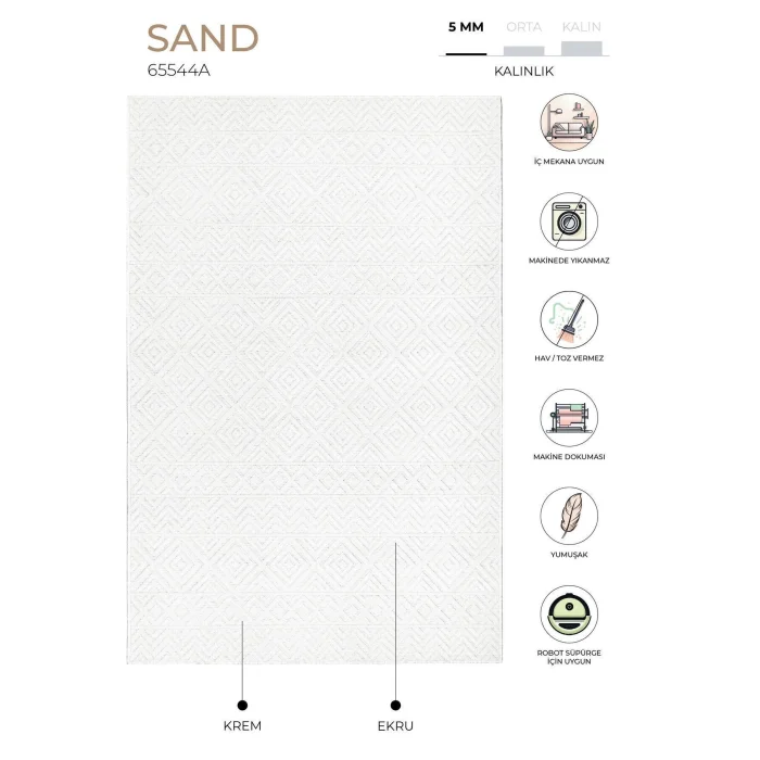 SAND PRODUCT FEATURES Our Sand collection is produced using polypropylene with Koza Carpet technology with a pile height of 4mm and a density of 320,000 stitches. HOW WAS IT MADE? By using polypropylene in modern Koza Carpet looms; It is produced on high-speed computer-controlled machine benches with high stain resistance, long life, durability and color fading. TECHNICAL INFORMATION -Polypropylene -320.000 stitches -4mm pile height -1,250gr/m2 USAGE AREAS -It can be used in balcony and terrace areas. CARE AND CLEANING Clean your carpet daily with a vacuum cleaner with a brush. Do not wipe with chemicals such as bleach, alcohol, etc. Do not wash it yourself, wipe it with a wet cloth and ventilate it. Sweep your carpet in the direction of the pile. Do not leave sharp, hard, heavy objects and items placed on the carpet in the same place for a long time. When not in use, keep your carpet in rolls away from moisture and vertically. Do not expose to direct sunlight. The above reasons and stains during use exclude your carpet from the scope of warranty.