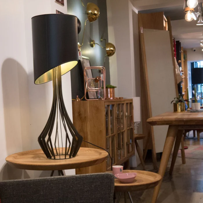 Drop floor lamp has a black painted metal base. For the shade it has linen fabric and pvc options are avaliable. Fabric is beige linen, pvc is black and gold (inside) Cable size 70cm., 220V/50hz, socket 3xe27, max 60watt.