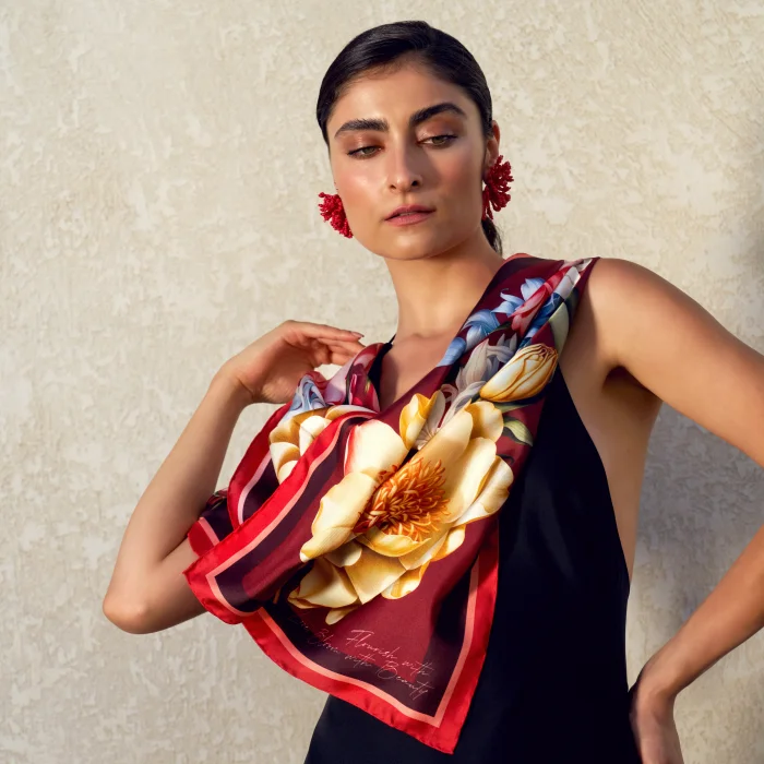 Material: 100% Twill Silk (14 mm) Edge Workmanship: Carefully hand-sewn by artisans. Pattern: Floral Size: 90x90 cm Usage: You can use it as a neck shawl, headscarf, hair, shoulder or beach accessory or bag ornament.