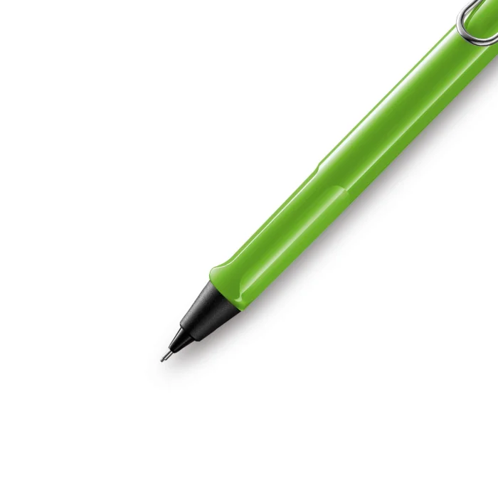 LAMY Safari series versatile pen with glossy apple green mechanism Tip Thickness: 0.5 mm Durable plastic housing Flexible Unique Metal Clip Ergonomic Grip Includes LAMY M41 pen nib, Z18 eraser and cleaning needle. Designer: Wolfgang Fabian International Design Award: IF Made in: Germany