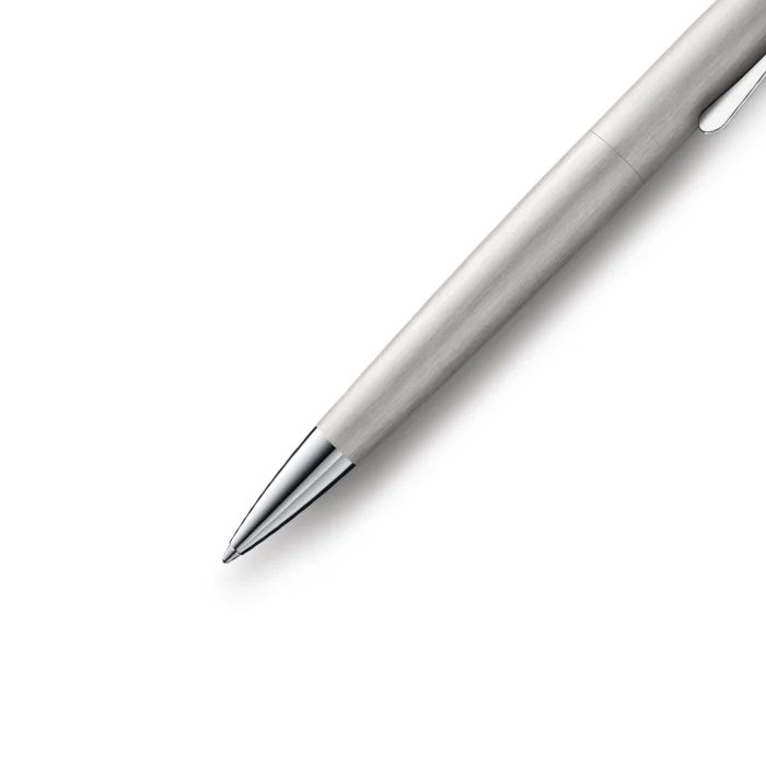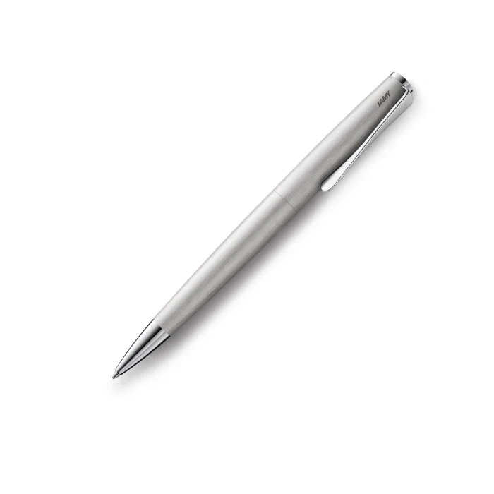 LAMY studio series textured steel body ballpoint pen, Turn-open mechanism from the body part, LAMY M16 contains black reflux, Designer: Hannes Wettstein International Design Awards: Good Design and IF Made in: Germany