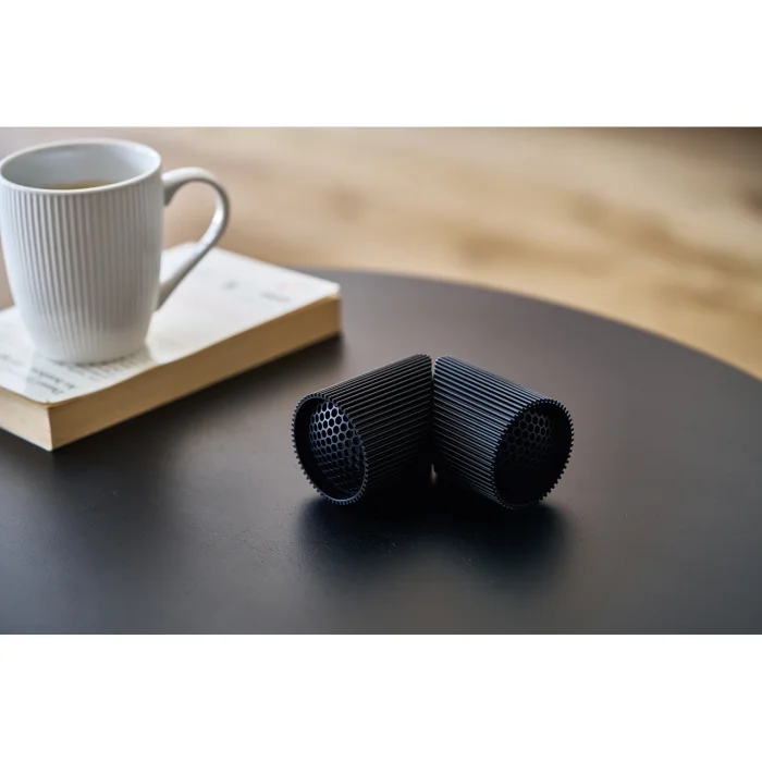 – Magnetic Bluetooth® speaker duo – TWS compatible for stereo experience – Hands-free microphone – Selfie trigger – Suitable for outdoor use (IPX4) – Battery life: up to 8 hours – Charging time: 3 hours – Rechargeable via USB-C (cable included) – Power adapter: USB 5V (not included) Aluminum – Magnetic metal – ABS – Silicone 4.8 x 5.7 cm 105 g
