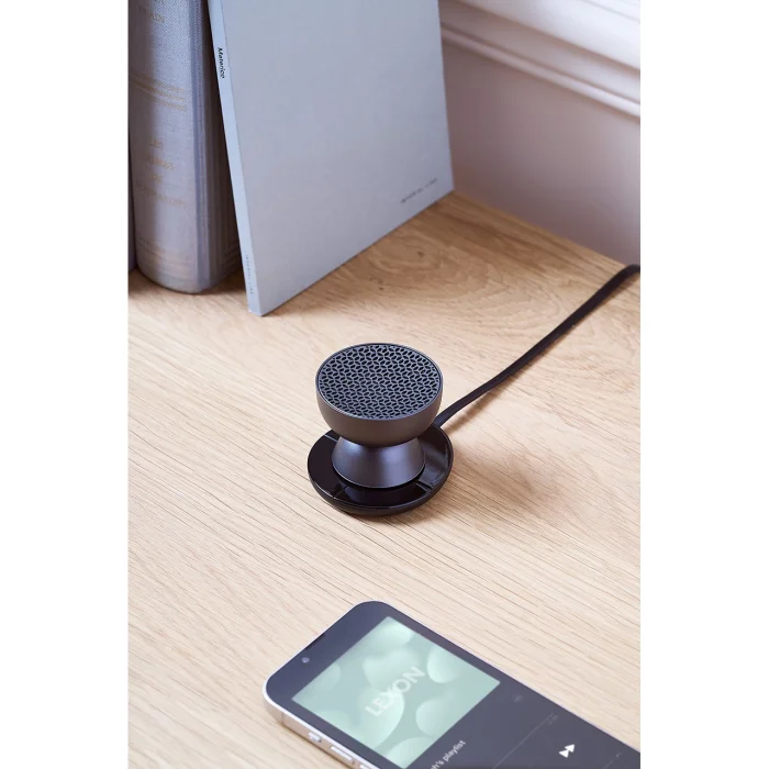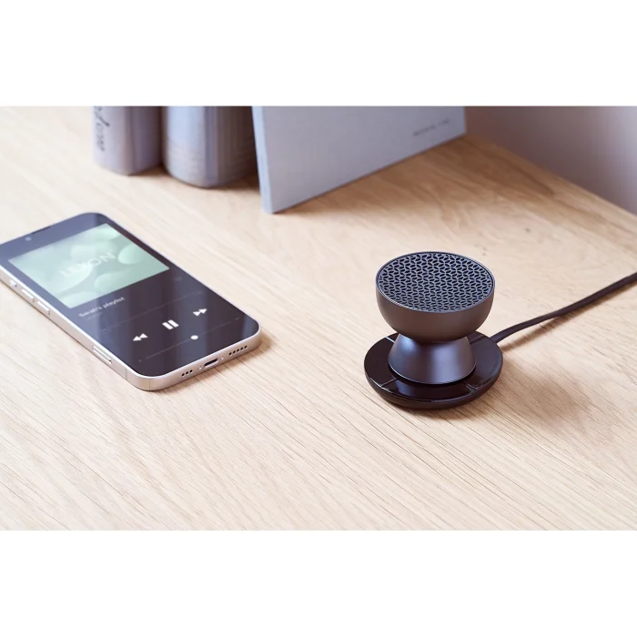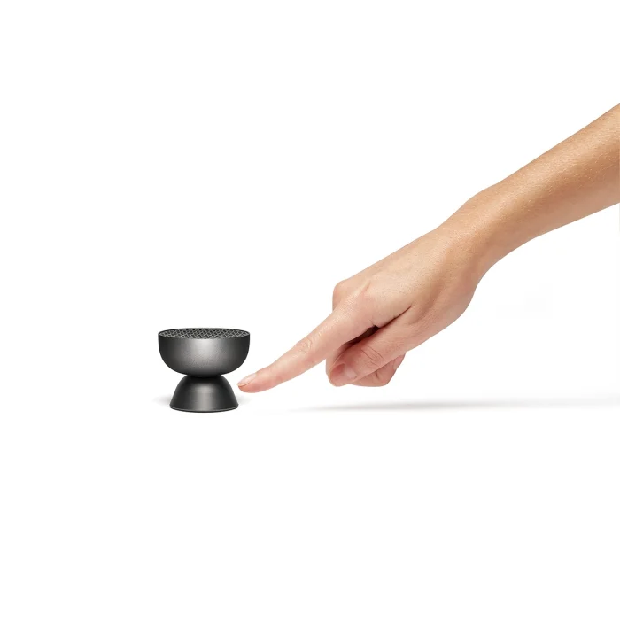 – Mini Bluetooth® speaker can pair an infinite number of – Can be paired with TWS – Touch control on the base for volume controls and volume adjustment – Hands-free microphone – Selfie trigger – Suitable for outdoor use (IPX4) – Battery life: up to 3 hours – Charging time: 1 hour – USB-C (cable included) or contactless rechargeable – Power adapter: USB 5V (not included) Aluminum – ABS 5.3 x 4.2 cm 55 g