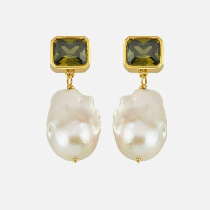 Product: Khaki Green Crystal Stone Baroque Pearl Dangle Earring