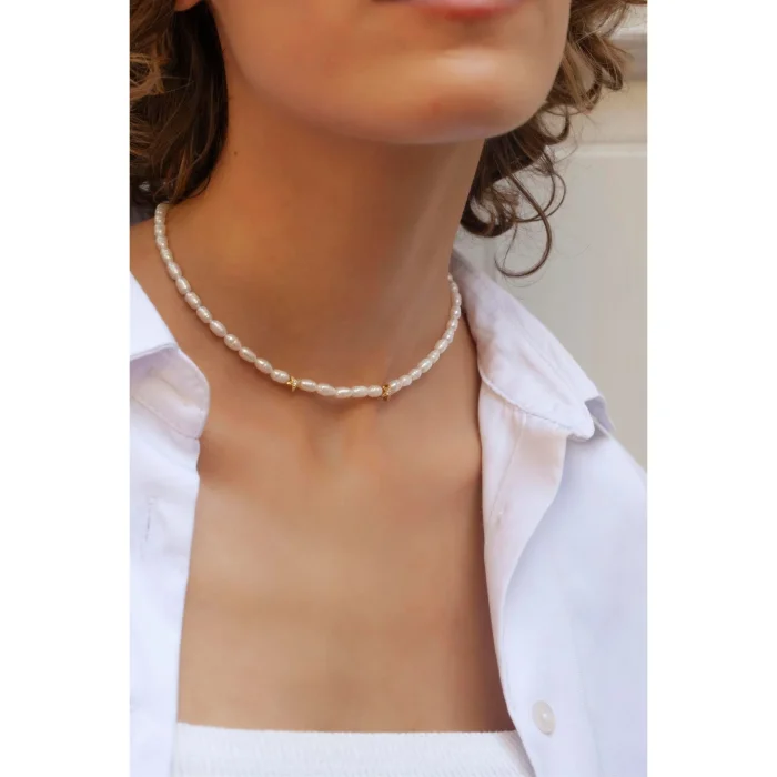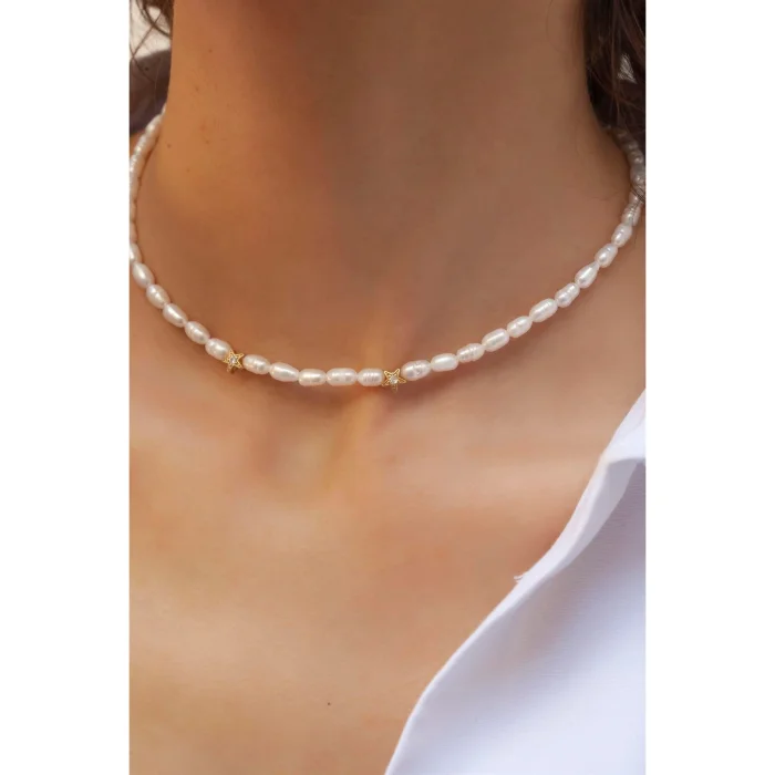 Rometta Star Pearl Necklace A natural pearl necklace that will keep up with your sporty and casual elegance. If you are looking for a stylish and elegant accessory that will accentuate your style, our new collection is for you. All of our products are handmade in our own workshop without sacrificing quality. Rometta Star Pearl Necklace Features: 925 Sterling silver; 22K Gold plated; Necklace Color: Gold; Approximate Silver Weight: 12.23 grams. ; Natural barley pearl is used. On the spacers, the minimal star symbol is set in stone. ; It is 40 cm long, has an extension of 2 cm, is adjustable. ; Sold individually.