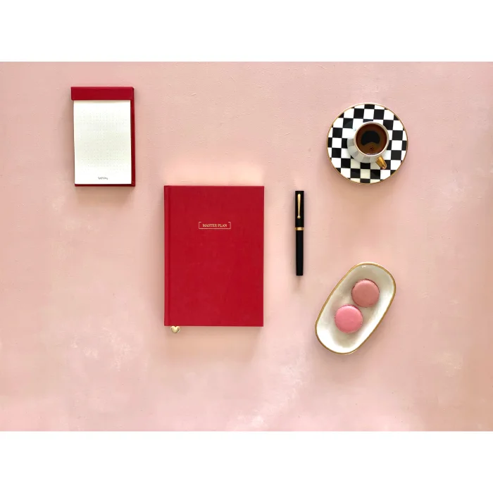 Cherry Red Master Plan Undated Planner Notebook. We have produced this Cherry Red Planner with a 100 gram top quality cream color fountain pen friendly paper and a hard cover. We bound it with a characteristic fabric and traditional methods. - 240 pages with gilded edges - 12-Month, 1-Year Overview - 60-week, 12-month, 1-year outlook - 12-Month, 4-Quarter, 1-Year Review tables - 1 bracket contains the ribbon and the heart at the end. The Master Plan is a goal-oriented, date-free, weekly planner that will support you in maintaining your focus as you reach them, motivating and inspiring. Now, you can start your planner at any time. Each new day is full of a new beginning and possible opportunities. Set your goals for the next 12 months now and start planning today. This planner is at your disposal for you to set your goals, prioritize your tasks and to-dos to take action, record your habits, progress, income, expenses and savings, and track them on a weekly, monthly, quarterly, and yearly basis. You'll also be able to write down your inspiration and gratitude as you experience your significant life events and celebrate your major accomplishments. The Master Plan will always be with you with all its elegance while you realize your plans. Each month starts with a motivating and inspiring quote, a monthly overview and a monthly overview tables, allowing you to set the tone for the month. Each month includes 5 weekly reviews, each weekly outlook includes columns with a 30-minute time interval from 7:00 a.m. to 9:00 a.m. on weekdays, and a dedicated column on weekends, and continues with a monthly review table where you can evaluate it. There are also 4 quarterly and one-year review pages where you'll track your annual goals. Our brand new page design is now available with 3 soft color backgrounds and warm gray texts. Green for the yearly, pink for the monthly and quarterly, and beige for the weekly looks add a new twist and color to the Master Plan. Stickers, wish list, notes and pen test sheets are other features of the New Master Plan. We used our Master Plan logo on the cover and with our brand symbol, the heart, with gold leaf gilding on the back of the skin and eye-catching simplicity. A choice of 5 different cover colors reflects our passion for nature-inspired design and can be complemented by a Notepad in the same color from our latest collection. Aspiring writers can also combine their Master Plan with a Notebook. Accessories used for photo and video shooting are not included in the price. Differences between the lighting and the screens of the devices may cause the colors to be displayed differently than they are.