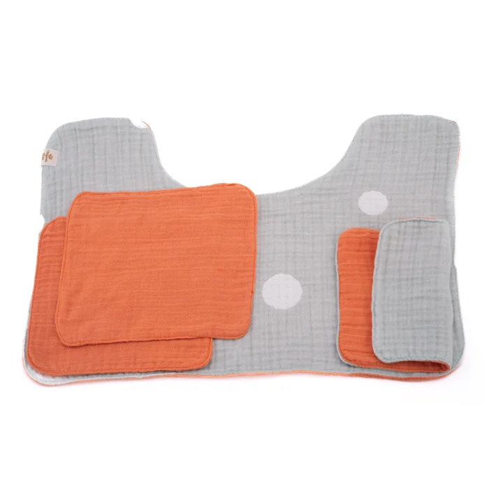 The front of our shoulder cloth consists of 4 layers of polka dot muslin and the back of it consists of 2 layers of solid colored muesli. Due to its multi-layered nature, it is both very soft and very absorbent. It can be used on both sides.