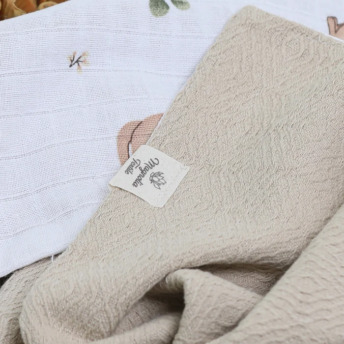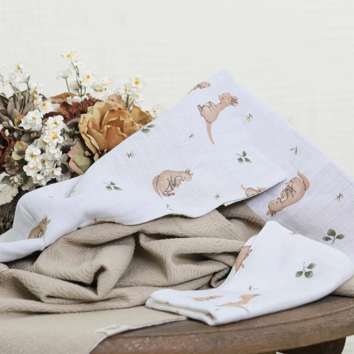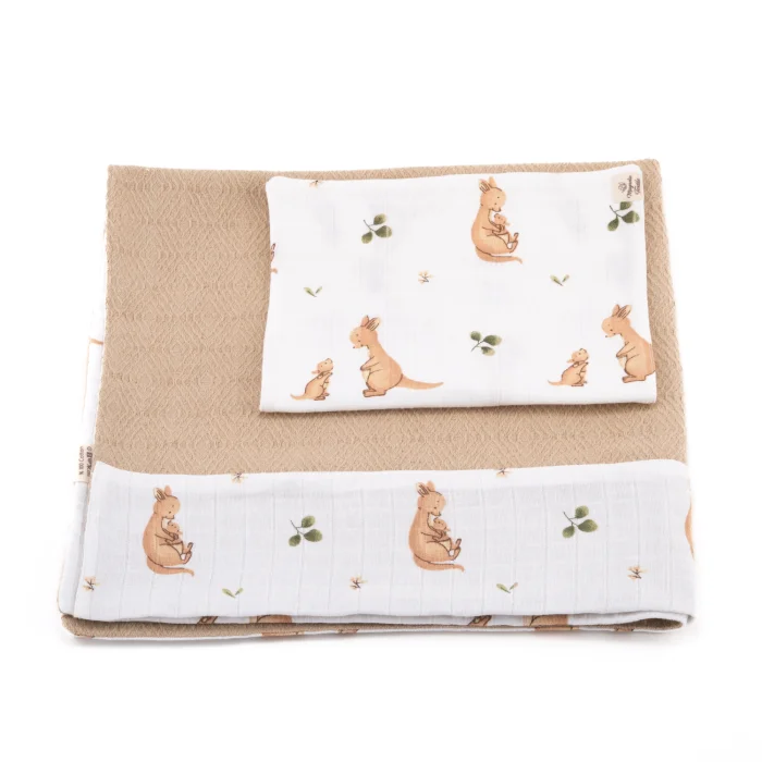 Our blanket is made of cotton piqué fabric. On the front of the blanket, soft muslin fabric with a kangaroo pattern is used. It is simple and convenient with pastel-toned colors.