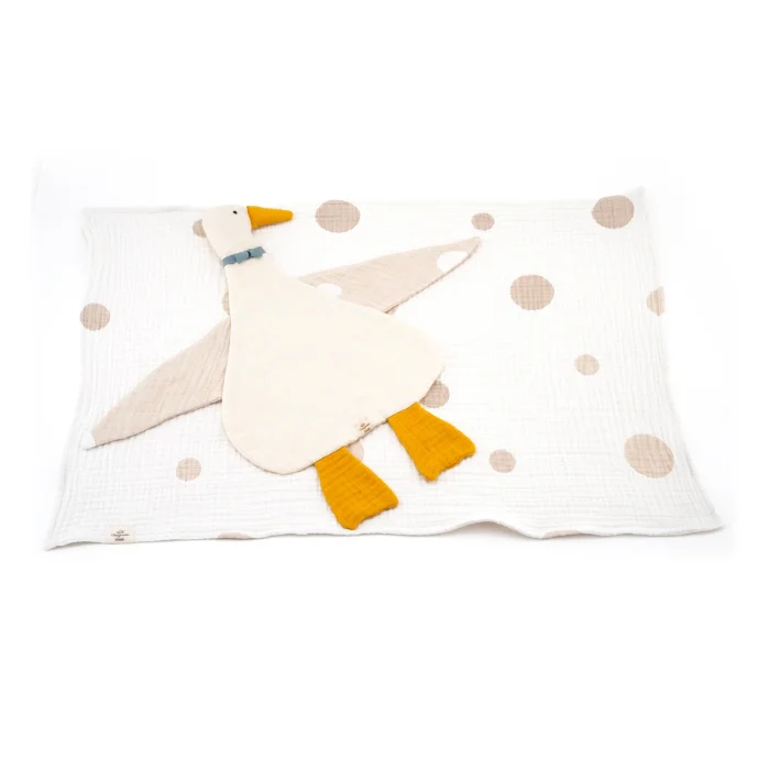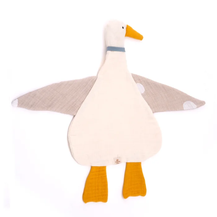 We are happy to introduce you to our favorite, handmade, 8 layered muslin duck lovey for babies and toddlers. It is so cute with its eyes and big beak on its face. We designed this goose with great happiness for your babies. Now we want to share this happiness with you.We have designed duck comforter with 8 layers muslin together to make it soft. We used high quality fiberfill stuffing for the duck's beak to ensure that they are nice and plump. We brought nature to your baby's room with this beautiful goose comforter.This security blanket is designed to be your little one's favorite toy, providing them with comfort and a sense of security. It envelops your baby in a cloud of comfort. This is the softest and loveliest blanket any baby could have. This is one of the baby essentials.The secret to our favorite goose toy's uniqueness? We use the softest muslin fabric since muslin is highly breathable, keeping your little one comfortable by providing warmth when needed and releasing excess heat when necessary. In addition you will be amazed with its lightness. You can take this goose toy everywhere with you since it needs less space. It is very comfy and cozy. This animal lovey is perfect as a gift for expecting mom and for baby shower. Personalize it with a name to make it an extra special gift. This fabric is OEKO-TEX Certified, so it's gentle on your baby's skin and eco-friendly (OEKO-TEX is a certification that ensures textiles are free from harmful chemicals).Fabric:- Back : 4 layers of 100% organic cotton muslin fabric- Front: 4 layers of 100% organic cotton muslin fabricStuffing:- Beak: Fiberfill stuffingDimension:Length : ≈19 inch (from head to the end of the foot)Width : ≈23 inch (including wings)Length of wing: ≈10 inchAll products are carefully packaged in specifically designed organic cotton bags for you. It is perfect for a gift.The actual color of the product may differ slightly due to the lighting sources in the photograph or your screen settings.We craft each item especially for you, so allow 1-3 business days for processing before it ships.