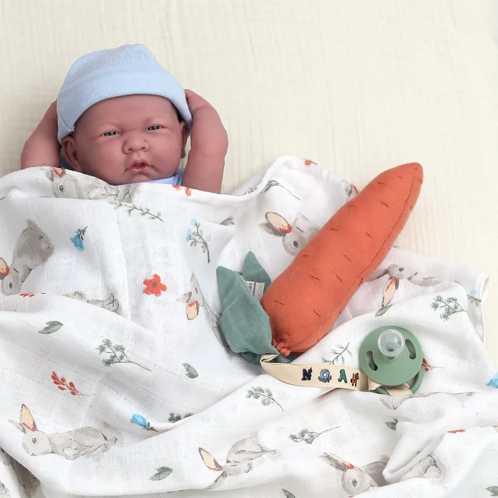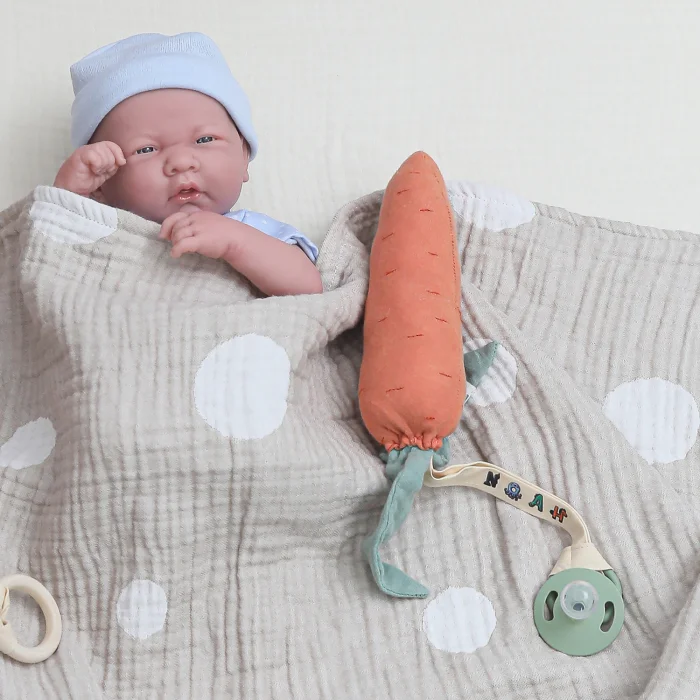 The teether/pacifier holder in super soft, organic, handmade 2-ply muslin fabric is shaped like a cute carrot. With its rattle design, it helps your baby develop their hearing. In this way, your baby interacts with the toy while learning to distinguish between different sounds, while at the same time contributing to your baby's mental development. It can be a baby's first toy. Carrot design supports the development of your baby's motor skills. Made from high-quality organic muslin fabric, this soft carrot provides soothing relief, especially during teething periods. Carefully crafted and designed for your baby's comfort and development, this teether/pacifier holder is essential for any parent. In addition, this carrot makes the pacifier/teether easy to find. The pacifier is not included in the product. This carrot can be used in a variety of ways, as a pacifier holder, relaxing toy, or as a décor in your babies or children's room. Carrot teeth are the perfect gift for newborns, babies, and toddlers. This carrot is shipped in a specially designed organic cotton bag. This fabric has the OEKO-TEX Standard, so it is gentle on your baby's skin and environmentally friendly. Fabric: Exterior: 100% organic cotton 2-ply muslin fabric and cotton ring Inside: Polyester (non-allergenic filling) Size: ~18 cm / 7" Length of rope: ~18 cm / 7"Can be used from birth. All products are carefully packed in organic cotton bags specially designed for you. Perfect for gifting