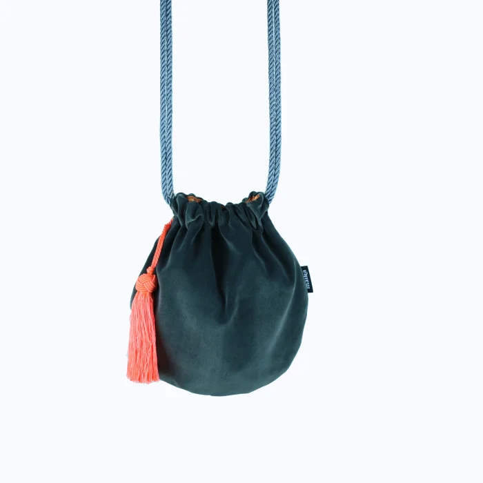 PRODUCT DETAIL Cotton velvet fabric, satin lining, Smoked color, Neon Orange tassel detail, Gray cordonette strap, side label Height : 26 cm. Width : 25 cm. Hanger length: 60 cm.