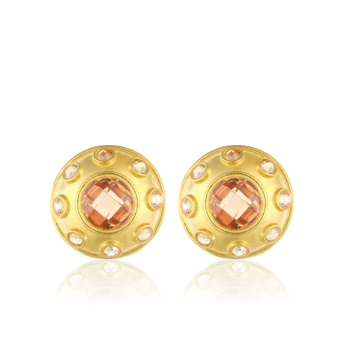 Handcrafted from 24-karat gold-plated silver-blended stainless brass set with Swarovski stones Free of nickel, lead and cadmium The earring pins are made of non-allergenic gold-plated 925 silver Measures: Total Diameter: 2.5 cm Approximate weight per earring: 9 g