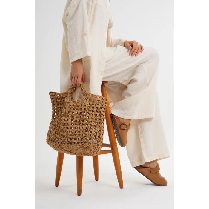100% handmade, knitted, caged, beach bag with straw colored paper. Depth 40 cm, width 50 cm