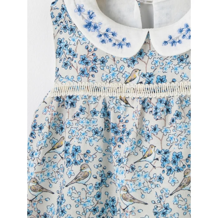 Baby collar, buttoned back and teardrop-shaped window detail, collar motif embroidery, lace detailed patterned lining sleeveless dress.