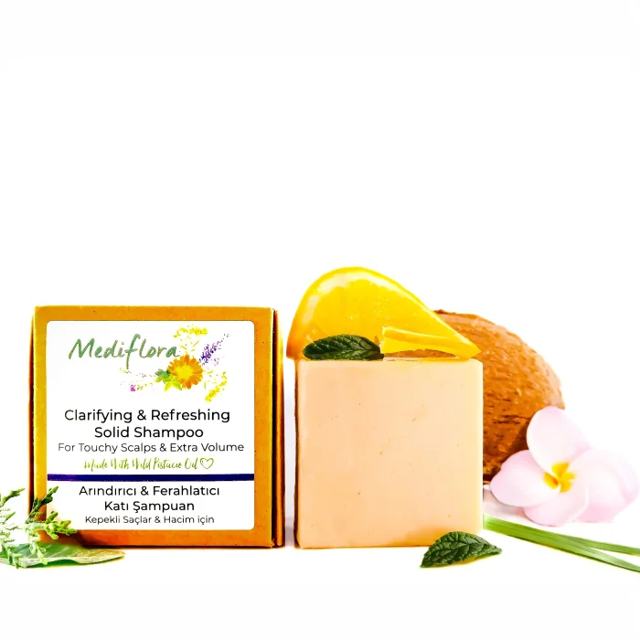 Product Description What is Purifying & Refreshing Solid Shampoo? Suitable for all hair types, it controls dandruff and scalp problems, gently purifies the scalp and adds volume to the hair. While relieving dandruff and scalp problems with sulfur, niacinamide, salicylic acid and wild pistachio oil, it refreshes the scalp with lemon grass, peppermint, juniper and orange oils and gives shine to the hair strands, balances the hair and scalp without drying it, the hair is easily combed after use. It can be used for scalp problems, in cases where both a gentle and highly purifying shampoo is needed due to excessive oiliness, on dry hair with product build up on the scalp, or simply for its refreshing effect. · Free of soap, synthetic fragrance, synthetic colorants · Concentrated · Free of harmful chemicals · Silicone free · Contains no animal products · Travel friendly · Nourishes hair with wild pistachio oil and sulfur · Envelops hair with a refreshing scent of pure essential oils How To Use Wet your hair and apply the solid shampoo by wetting it and rubbing it on the scalp, please use a container to save water instead of running water to wet the product from time to time while applying, then massage your scalp with your fingertips, lather and rinse. Allowing your solid shampoo to dry without contact with water will prolong its use. For this reason, we recommend that the product is left to air dry after each use on a soap dish with drain holes or on your shower wire, without contact with water. Ingredients Sodium Cocoyl Isethionate, Sodium Coco Sulphate, Decyl Glucoside, Stearic Acid, Cetyl Alcohol, Distearoylethyl Hydroxyethylmonium Methosulfate (and) Cetearyl Alcohol, Glyceryl Stearate SE, Theobroma Cacao (Cocoa Seed Butter), Niacinamide, Betaine, Polyquaternium-10, Glycerine, Tocopherol (Vitamin E), Sodium Citrate, Benzyl Alcohol (and) Dehydroacetic Acid, Sulfur, Pistacia Terebinthus (Wild Pistachio) Fruit Oil, Salicylic Acid, Cymbopogon Nardus (Citronella) Oil, Mentha Spicata (Spearmint) Oil, Juniperus Communis (Juniper) Seed Oil, Citrus Aurantium Dulcis (Orange) Peel Oil, Avena Sativa (Oat) Flour 110 gr
