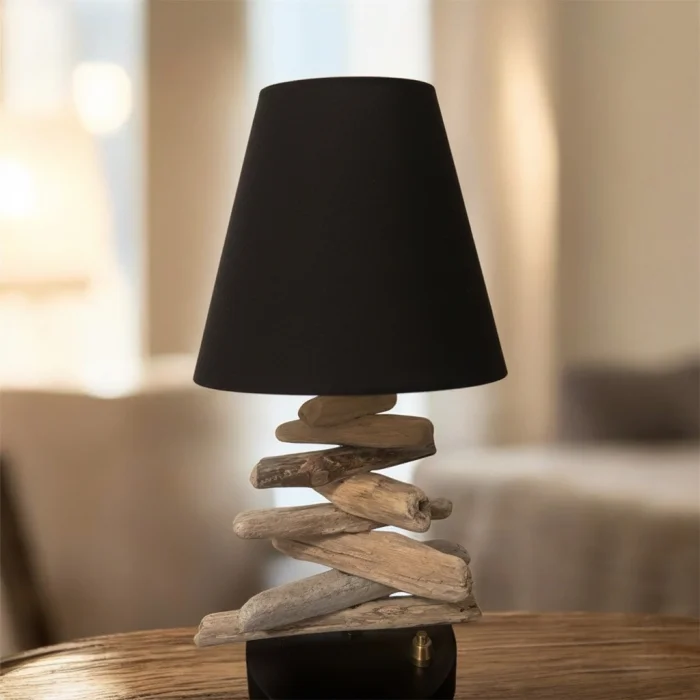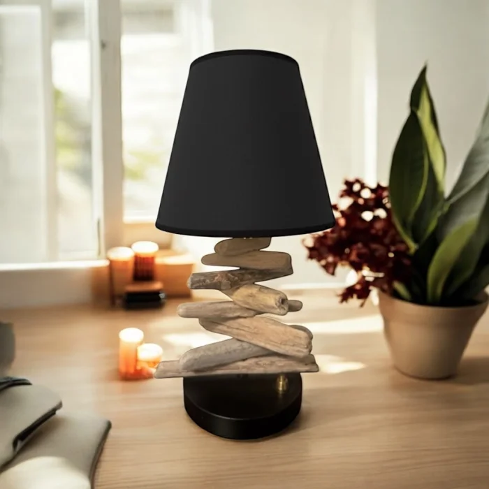The work will be placed in the box and carefully packaged to prevent damage during shipping. Since it is handmade, there may be color and pattern differences. It is operated with the click key system. The cap color is black and its diameter is 18 cm. The total height of the lampshade is approximately 33 cm (may vary depending on driftwood dimensions).