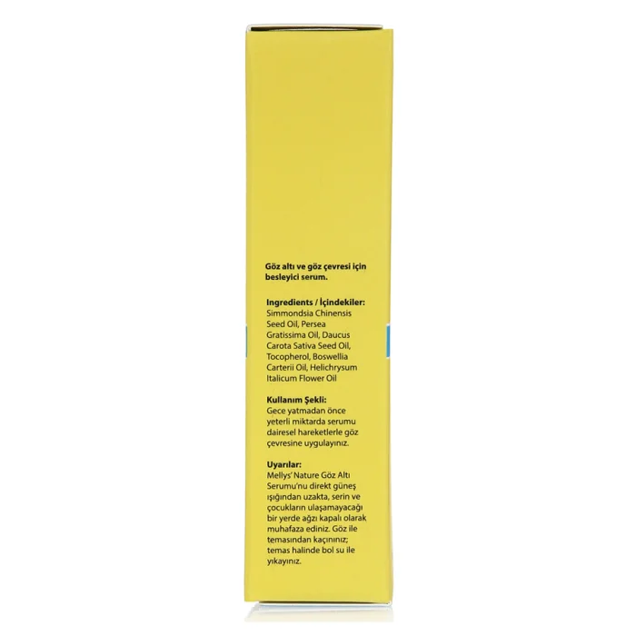 Mellys’ Nature Under Eye Serum is inspired by goodness of nature that is specifically formulated with %100 natural essential& cold-pressed oils to hydrate or firm the delicate skin around the eyes.Mellys’ Nature Under Eye Serum is a 100% natural, vegan, plant-based and contains no fillers, toxins, synthetic fragrances, parabens or dyes.