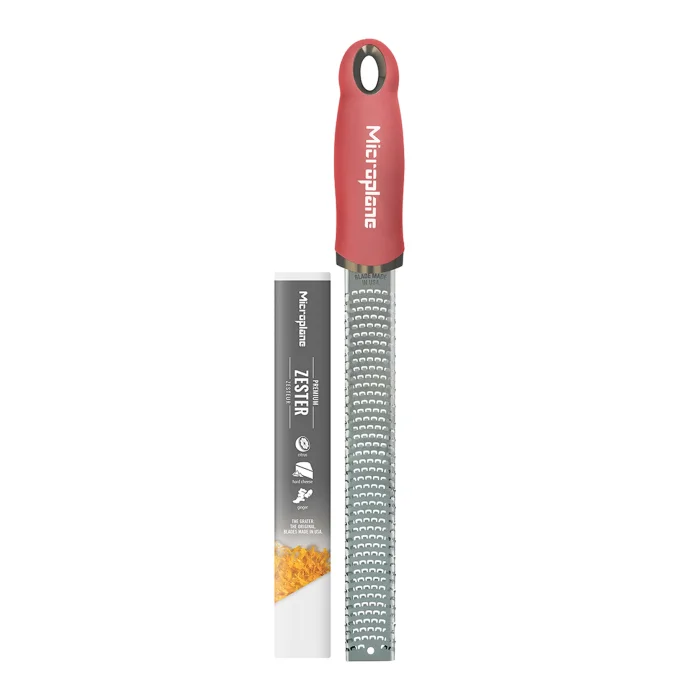 The original, iconic Premium Classic Zester, characteristically long and narrow revolutionized grating due to its ultra-sharp, photo-etched stainless-steel blade - made in USA. Featuring 400 micro-teeth, it is perfect for all citrus fruits, hard cheese, chocolate, ginger, garlic, nutmeg, truffle, spices, nuts and more.
