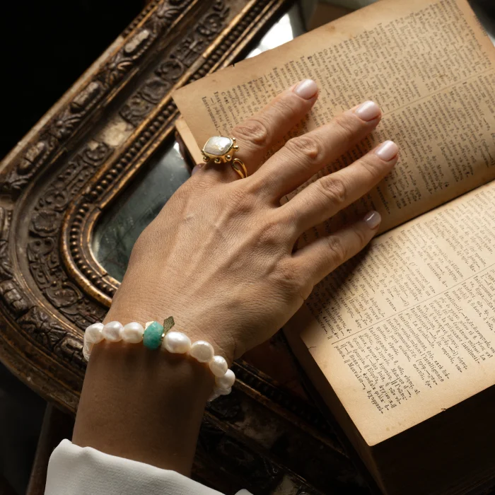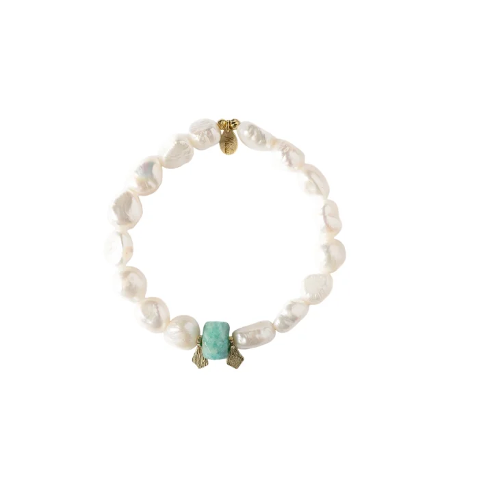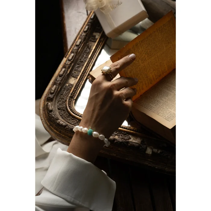 Pearl and amazonite were used. Amazonite, the stone of calmness and communication, relieves stress and increases expressiveness. 14K gold plated 925 silver Size: Standard
