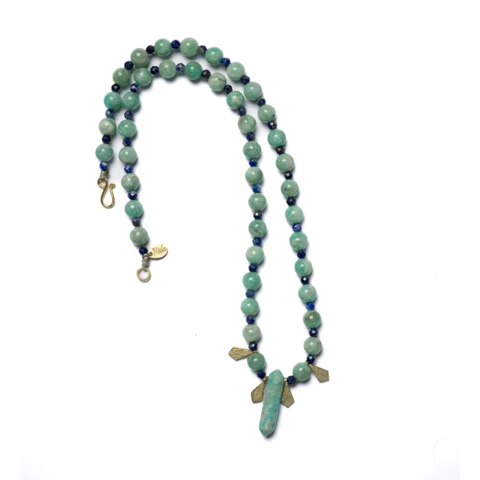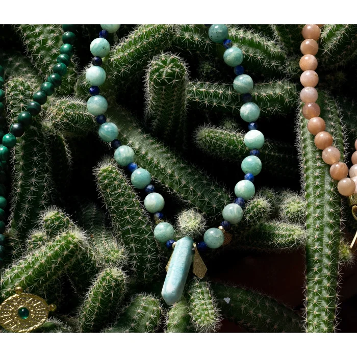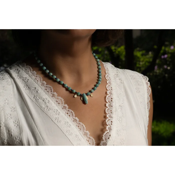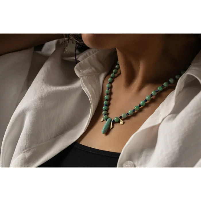 It is designed using amazonite and lapis lazuli stones. Like the gentle flow of large rivers, amazonite calms you down. He lightly carries all the weight in his heart. The stone of calmness and communication reduces stress and increases expressiveness. 14K gold plated 925 silver necklace length (open) :43 cm