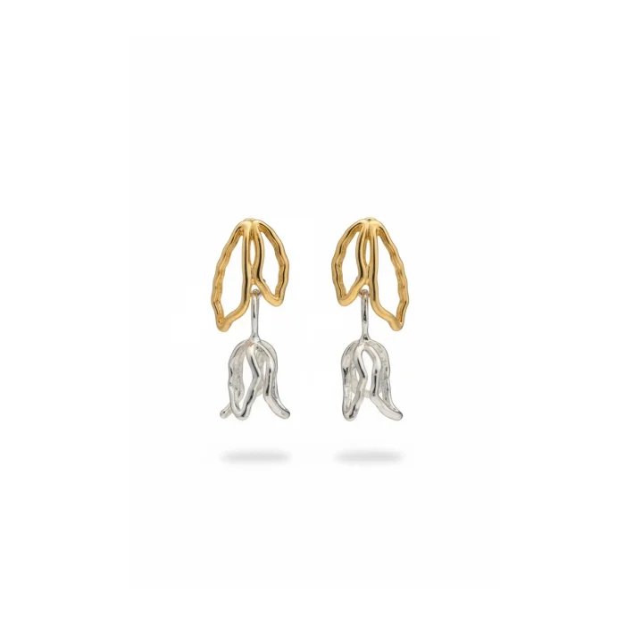 Starlie Two Tone Earrings offer an elegant yet characterful stance with their fluid and sculptural design inspired by the tulip form. Its two-tone structure, in which gold and silver plating are used together, gives the earring a modern contrast, while creating a striking silhouette in the ear thanks to its moving form. It is an ideal piece to complete your daily style with simple elegance or to add a strong touch to special combinations.